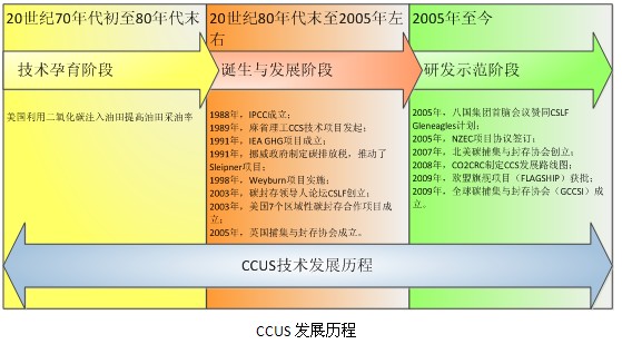 CCUS技术发展按照时间顺序,综合考虑技术、参与者、合作范围、法规建设等因素,大致可以划分为三个阶段:技术孕育阶段、诞生与发展阶段和研发与示范阶段。CCUS技术发展具体历程及重要事件如下图所示: