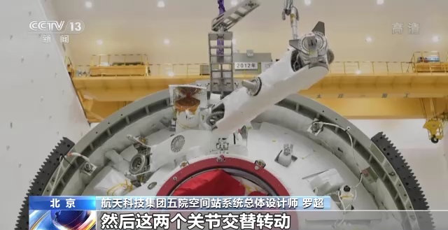 航天科技集团五院空间站系统总体设计师 罗超:它这两个关节,一个是在靠近梦天舱这头,称为肩关节,就像人的肩膀,在靠近天和核心舱这头叫腕关节,就是人的一个手腕。利用肩关节和腕关节的这两个转动,它前头还有一个捕获头来抓着核心舱,然后这两个关节交替转动,就相当于可以把这个舱挪移到核心舱的侧向停泊口。