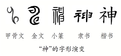 金文的“神”跟甲骨文外形近似,仍然像是闪电的形状。到了小篆中,在原字形的左边加上了“示”,表示“神”这个字跟祭祀有关:通过祭祀,可以求得神灵的保佑。隶书的“神”,左边的“示”逐渐变成了“礻”,右边的字形进一步符号化。楷书的“神”,左边基本不变,右边成了“申”的写法。“神”中的“礻”表示意义,“申”表示读音和意义。