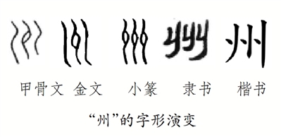 再来看看“州”。在甲骨文和金文中,“州”的字形左右两条曲线像河的两岸,中间像是水中的一块陆地,合在一起表示水流包围着一块土地。到了小篆中,整个字形受到了中间部分的影响,两边也开始与中间整齐划一。隶书的结构与楷书相似,但更加符号化,已经难以看出与水中的陆地之间的联系。