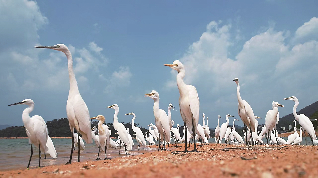 曾经的一次错过,让我遗憾了整整一年。那是一个周末,值班的同事发来视频告诉我,流溪河来了一大群白鹭,而此刻我远在200公里外的家,因事走不开。看着视频里大群白鹭在湖心岛上盘旋着,我心里有种说不出的失落感,来流溪河这么多年,我还没碰到过这么多白鹭。第二天回到单位,我用无人机把流溪河全域搜了个遍,也没看到白鹭的踪影。带着莫大的遗憾,我日思夜盼,终于在第二年的白露那天,盼来了那一大群白鹭!这次我终于没有错过!