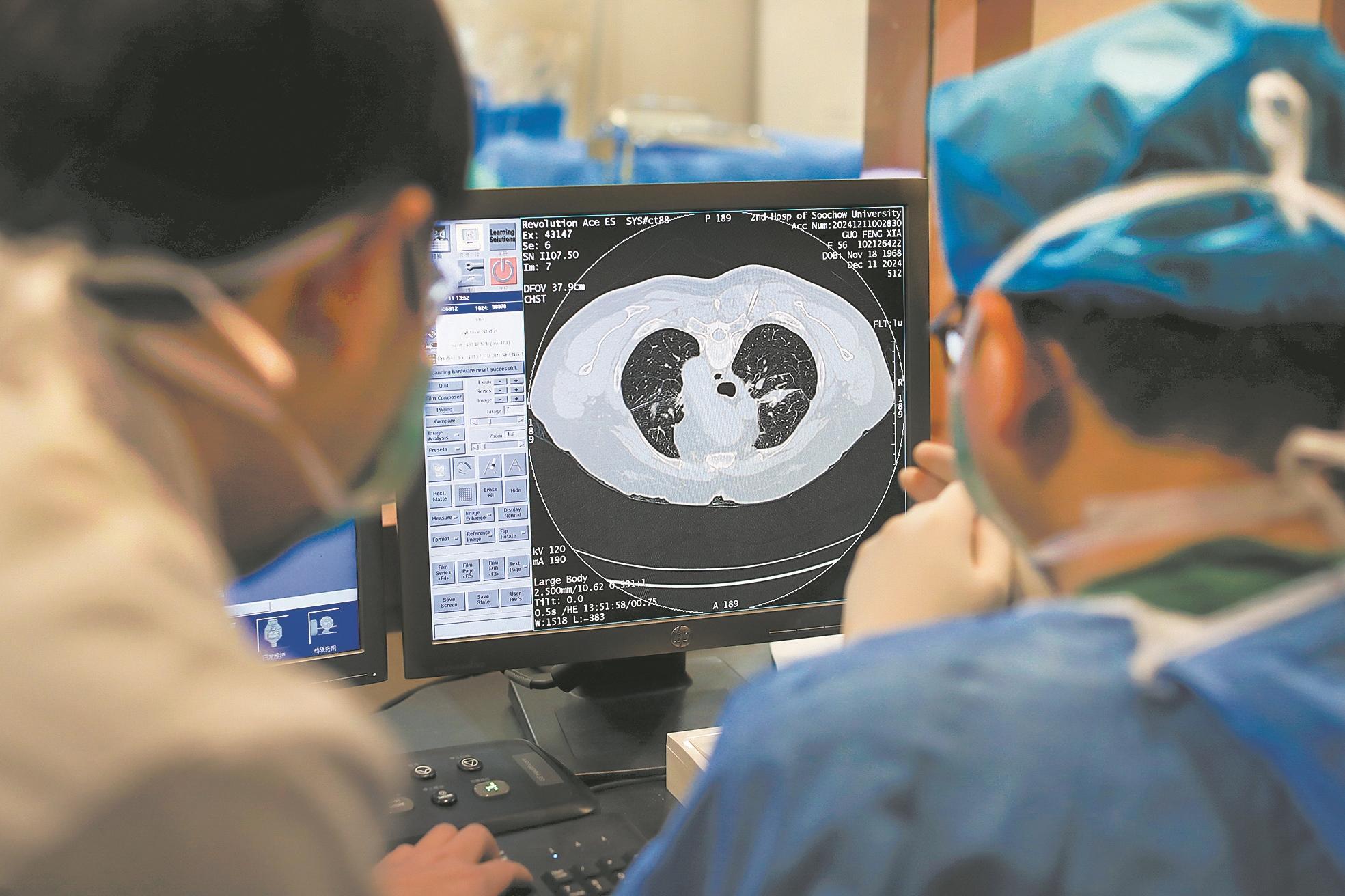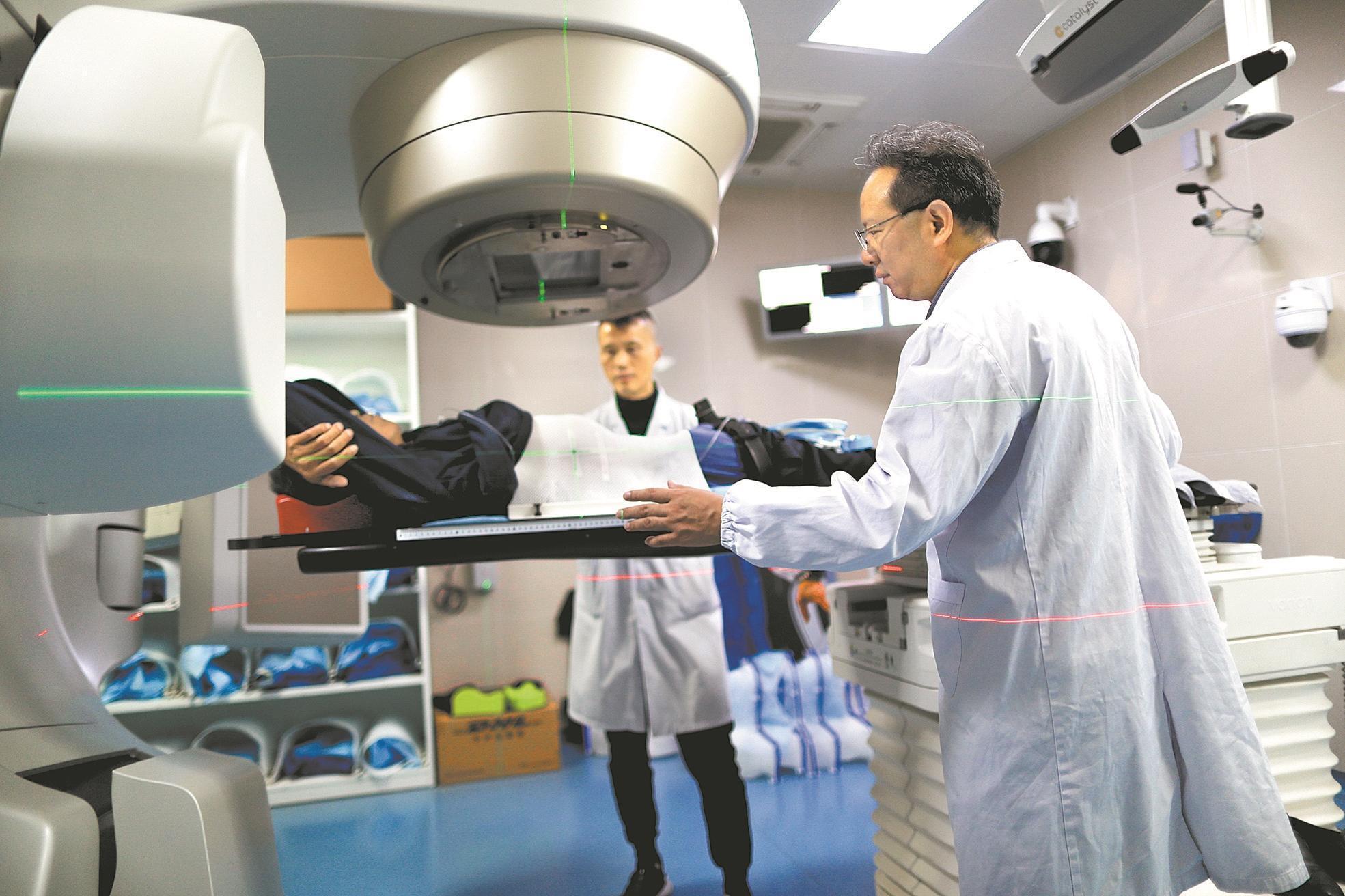 2024年12月11日,中国肿瘤放射免疫工作委员会副主任、苏州核工业总医院肿瘤中心执行主任张力元(前)利用核技术对患者进行精准治疗。