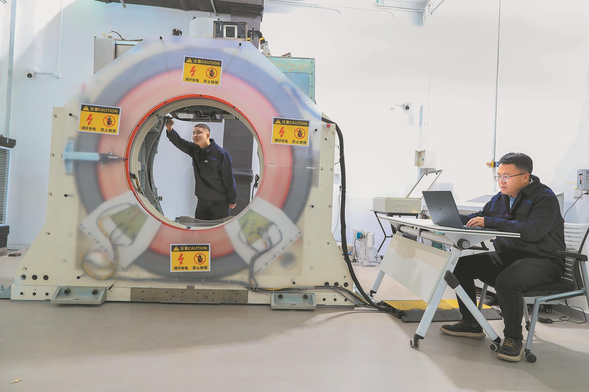 ▲2024年12月9日,北京亦庄中核粒子医疗科技有限公司内,研究人员在进行医用直线加速器诊疗设备性能测试。
