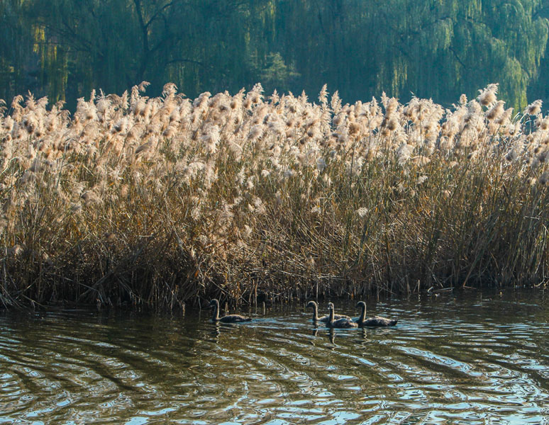 其中,芦苇是湿地环境中生长的主要植物之一。大面积的芦苇不仅可调节气候,涵养水源,所形成的良好的湿地生态环境,也为鸟类提供栖息,觅食,繁殖的家园。圆明园良好的生态环境吸引了黑天鹅、野鸭、鸳鸯等多种野生鸟类常年栖息、繁衍。