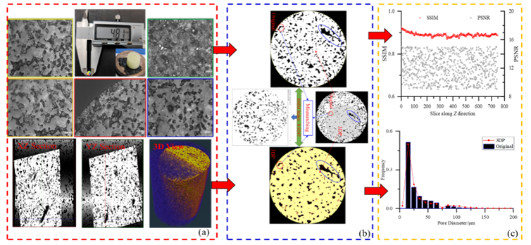 图1. 3D打印岩心与天然岩心微观孔隙结构的对比分析.(a)基于偏光显微镜和CT成像得3DP岩心孔隙结构表征;(b)基于图像校准的3DP岩心与原始岩心孔隙结构拓扑形态特征的对比分析;(c)孔隙结构特征参数的计算与分析