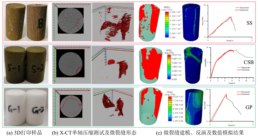 图3. 3D打印样品及其变形—破裂可视化实验及模拟结果