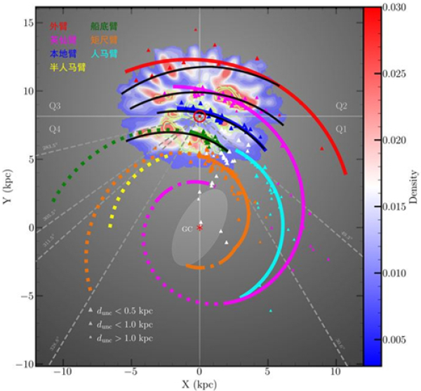 科研团队综合利用天体脉泽、年轻恒星和疏散星团等目前所能获得的全部高精度天体测量数据,重新描绘了银河系旋臂结构。研究表明,银河系具有多旋臂形态,其内部由英仙臂和矩尺臂两条旋臂对称向外延伸,在外部分叉并形成包括半人马臂、人马臂、船底臂和本地臂等多条长而不规则的旋臂段(如图)。银河系看起来不再特殊。