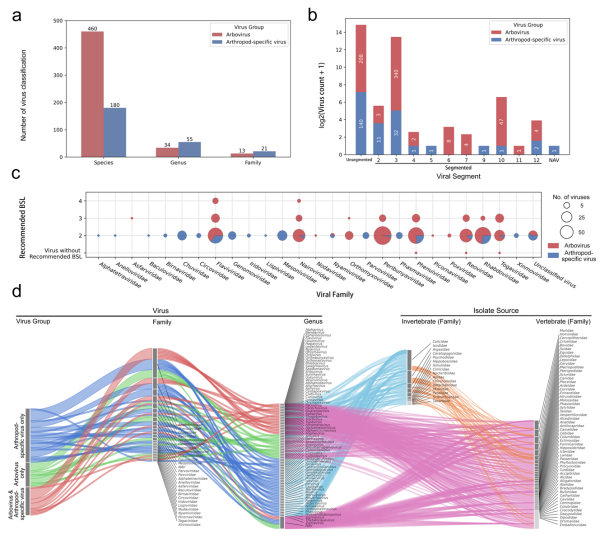 5月19日,《科学数据》(Scientific Data)在线发表了中国科学院武汉病毒研究所/生物安全大科学中心袁志明/夏菡团队在虫媒病毒生态健康和生物安全领域的最新研究成果(《全球虫媒病毒和节肢动物特异病毒的序列、多样性及生物安全风险综合数据集》,A global dataset of sequence, diversity and biosafety recommendation of arbovirus and arthropod-specific virus)。该研究通过整合美国CDC虫媒病毒名录(Arbovirus Catalog)、第六版《微生物和生物医学实验室生物安全》(BMBL 6th)附录VIII-F、国际病毒分类委员会(ICTV)的病毒分类信息以及Genbank序列等相关信息,提取分类学、生物安全风险、基因节段、核酸和氨基酸序列、地理分布等信息,构建了首个全球虫媒病毒和节肢动物特异病毒的综合数据集。