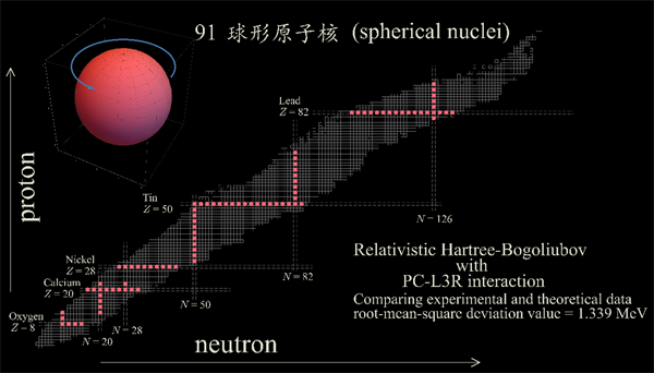 图1.91个球形原子核(红点),背景小方格代表实验上已经测量到结合能的原子核。(图/卢宁、蓝乙华)