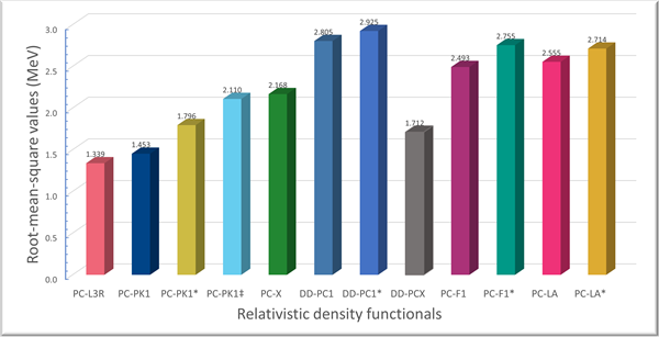 图2.91个球形原子核结合能的实验与理论相比均方根。在众多点耦合相互作用当中,PC-L3R点耦合相互作用给出最接近实验值的理论结合能。(图/蓝乙华)