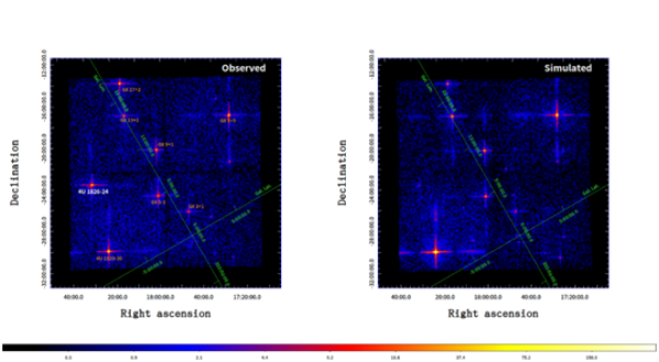 图2.莱娅对银河系中心天区单次观测获得的X射线图像(左图)和地面仿真图像(右图),左右图的观测时长同为798s,能段为0.5-4 keV,视场18.6度x18.6度。(左图中标记为4U 1826-24的源是捕捉到的一个变亮的中子星X射线双星)。