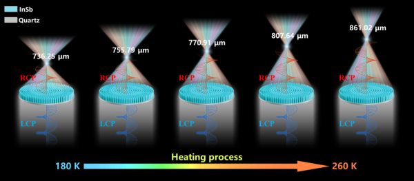 研究团队基于Ⅲ-Ⅴ族半导体材料锑化铟(InSb)设计了性能优异的单元结构。随后,该团队采用几何相位和传输相位相结合的方式,巧妙设计超透镜单元结构的排布方式与空间取向,采用单层超透镜实现了太赫兹波的宽频带聚焦,有效消除了色差现象。进一步,该研究通过改变器件工作温度,进而调控器件单元结构的相位补偿范围,实现了焦距736.25 μm (NA = 0.62)至 861.02 μm(NA = 0.56)的连续变焦。该成果为设计多功能消色差超透镜提供了新思路,并有望进一步拓展太赫兹频段超透镜在显微成像和内窥镜等领域的实际应用。