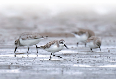 国家一级重点保护野生动物勺嘴鹬在深沪湾滩涂一带栖息觅食。