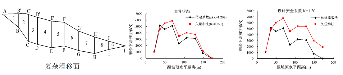 为验证下滑推力矢量和法的合理可靠性,选择典型算例和工程实例进行了对比分析,圆弧形滑面和缓倾滑移面计算结果对比表明,下滑推力矢量和法计算结果和传递系数法结果吻合较好;而对于相邻条块大于10°的典型复杂滑坡体,传递系数法安全系数(1.202)相对严格极限平衡M-P法(0.988)误差高达21.7%,而下滑推力矢量和法(0.991)误差仅为0.3%,可见,下滑推力矢量和法也适用于相邻条块倾角变化大于10°的复杂滑坡体。