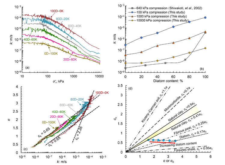 中国科学院武汉岩土力学研究所特殊土土力学组徐倚晴硕士与张先伟副研究员等,通过环境扫描电镜、原子力显微镜等微观测试技术调查了含硅藻化石沉积物的纳米至微米级别的结构特征,发现硅藻骨架的中空孔隙是造成硅藻土高孔隙比与高液限值的主要原因;借助高压等应变速率压缩试验,研究含硅藻化石沉积物的压缩、回弹与水力特性,发现了大体积的内骨架孔隙与硅质骨架是引起硅藻土具有高压缩性与低回弹性的主要原因,同时高压下的硅藻渐进性破碎会进一步提高土的压缩潜势;最后,耦合宏微观分析,提出一个能够反映硅藻破碎与孔隙结构演化的含硅藻沉积物的压缩概念模型。本研究对于深入了解生物质沉积物的力学行为机理,对含硅藻软弱夹层的海底滑坡稳定性分析有一定的帮助。