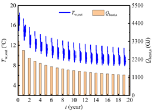 图1.岩土储能原理以及20年供暖期出口水温和供热量预测