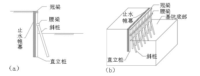 图1人字形排桩支护结构形式图:(a)剖面图;(b)斜视图