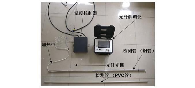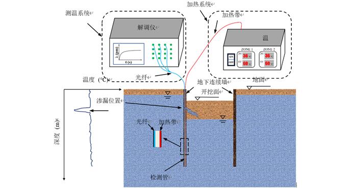 二、研制了一套基于光纤温度传感的地连墙接缝渗漏检测监测新装置。该装置由检测管、光纤测温系统、加热系统组成(图3~4)。检测管布置在槽段接缝处,用于固定和保护加热带和光纤光栅,并起到传递热量的作用;光纤测温系统由光纤解调仪、光纤温度传感器、检测管组成,用于测量地连墙接缝处的温度分布及变化;加热系统由温度控制器、加热带组成,通电加热使检测管达到稳定的温度与渗漏水之间形成明显的温差,提高测温系统的敏感性。新装置自上而下连续检测、监测地下连续墙接缝的漏点分布,克服了传统方法点状布置造成的漏检、漏报险情问题,实现了地下连续墙接缝渗漏的快速准确识别。