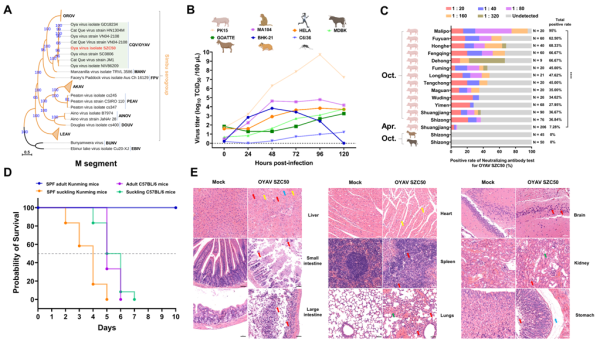Oya病毒库蠓新分离株的遗传进化(A)、体外感染特征(B)、家畜血清抗体阳性率(C)、感染小鼠的生存率(D)和组织病理学特征(E)