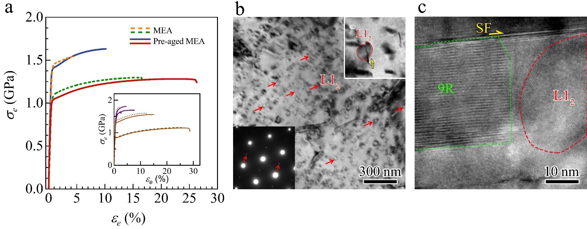 图. (a)预时效处理与未处理的多组元合金的应力-应变曲线;(b) 预时效处理获得高密度共格纳米沉淀相及位错切过沉淀相;(c) 变形后位错、层错与沉淀相的交互作用。