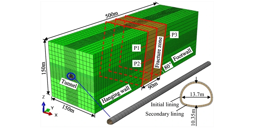 在我国,活动断层广泛发育。对于跨活动断层隧道而言,断层错动引起的永久变形通常会对其造成张拉、扭剪、弯曲破坏,严重者甚至会造成大幅度错台或整体坍塌,例如在2022年1月8月青海门源6.9级地震中,断层错动致使大梁隧道严重错位。因此,有必要关注断层错动下隧道响应,以期指导隧道抗错断设计。