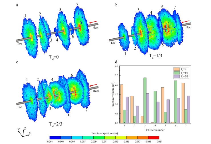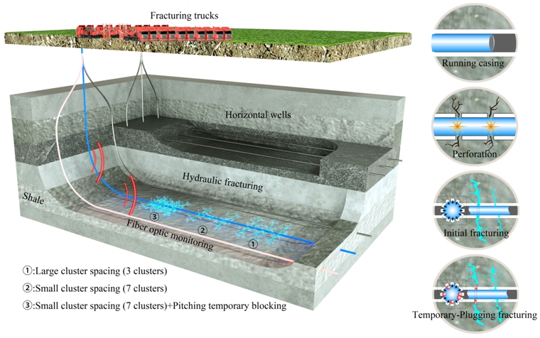 为此,中国科学院武汉岩土力学研究所油气地下储备与开发研究中心科研人员,联合长江大学和中石化江汉油田相关研究人员,对深层/超深层页岩气水平井缝口暂堵压裂的裂缝调控模式进行了研究。研究结果表明:缝口暂堵可显著促进多裂缝的均衡延伸,对于深层页岩当两向水平地应力差值超过10MPa时,该工艺措施依然有效;随着暂堵球数量的增加,储层改造体积SRV先增大后减小,存在一个最优的暂堵球数量;当暂堵时机为总泵注量的2/3时,裂缝差异化系数最小,各簇裂缝可实现均衡延伸;此外,建议严格控制暂堵球质量,最大程度降低暂堵次数,提高作业效率。