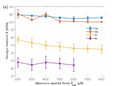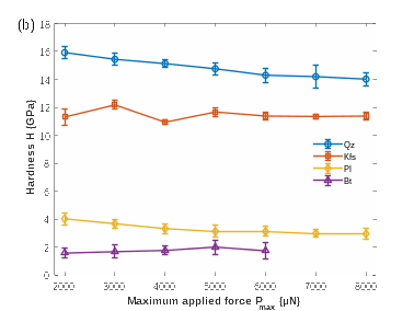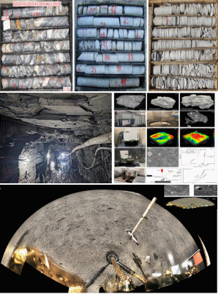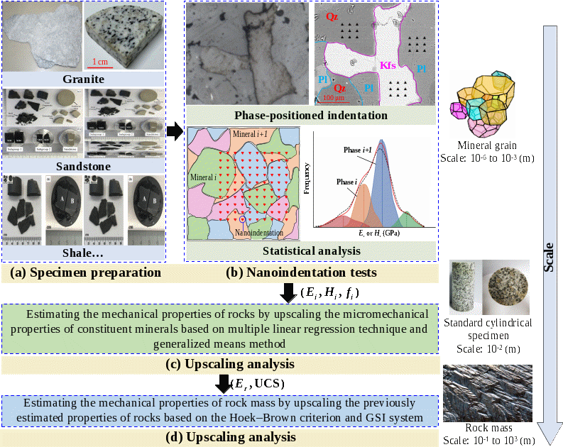 为了解决这一难题,中国科学院武汉岩土力学研究所智能岩石力学团队博士研究生柳秀洋等人在徐鼎平研究员的指导下,提出了一种基于岩石矿物和矿物界面纳米压痕试验结果来估计岩石及岩体力学参数的简化技术路径。首先采用相位识别压痕技术或统计反卷积压痕技术确定岩石中组成矿物的微观力学特性。随后,利用多元线性回归技术和广义均值方法将这些微观矿物力学参数升尺度分析,以估算标准岩石样品的弹性模量和单轴抗压强度。接着,通过钻孔成像和高清拍照技术获取岩体的地质强度指数(GSI)。最后,将前述估算的岩石弹性模量、单轴抗压强度和GSI值结合起来,基于Hoek-Brown准则进一步升尺度分析,从而推算现场岩体的力学性质。这项研究突破了毫米-厘米级细小试样、厘米-分米级室内岩样和百米-千米级工程岩体力学参数之间难以有效关联的鸿沟。该研究为解决深地、深空等取样极端困难条件下的岩体力学参数估计提供了一种简易可行的思路。