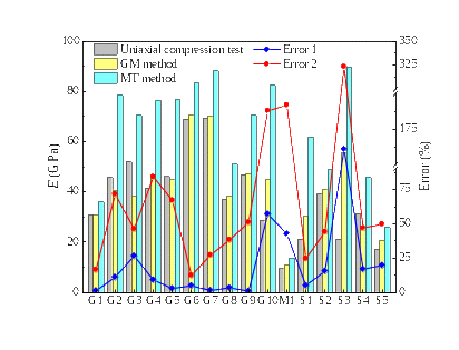 图4 基于广义均值、Mori-Tanaka法以及单轴压缩试验中获得的弹性模量的比较