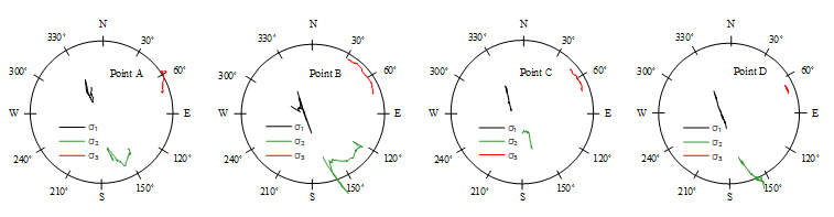 图4 中国锦屏地下实验室二期B2实验室扰动主应力方向变化特征