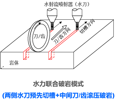 图2 水力联合破岩模式:两侧水刀预先切槽+中间刀/齿滚压破岩