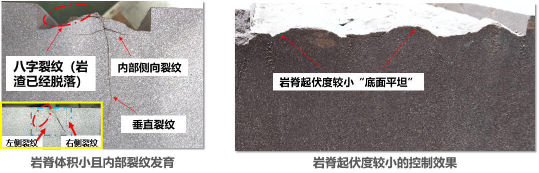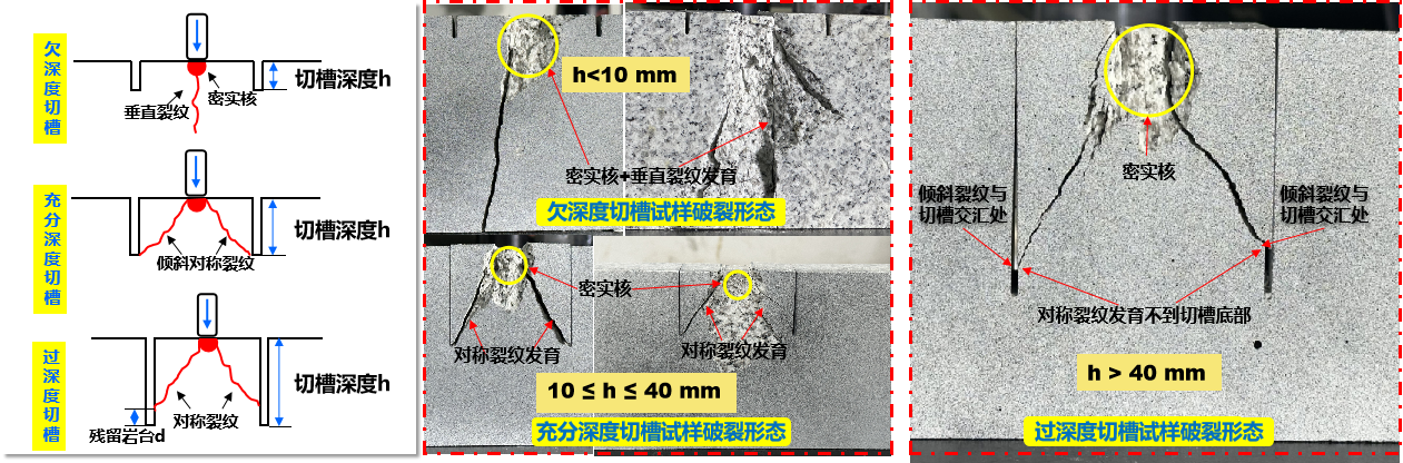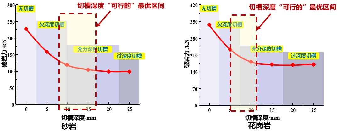 对此,中国科学院武汉岩土力学研究所岩体工程多场耦合效应团队开展了新型水力联合破岩技术研究,取得的主要研究进展包括:研制了高围压水力联合线性破岩试验系统,可开展30MPa围压条件下的常规类型滚刀、多技术预处理以及水力联合的线性切削破岩试验;揭示了“两侧水刀预先切槽+中间刀/齿滚压破岩”联合破岩机制,揭示了切槽深度控制下的3种破岩形态:欠深度切槽,充分深度切槽以及过深度切槽,确定了切槽深度“可行的”最优区间;开展了不同岩性、刀具类型、槽深、槽间距、贯入度等参数影响的线性切削破岩试验,提出了“切多深、破多深”的最优破岩效果的参数优化匹配技术;开展了不同岩性纯水、磨料的高压水射流切槽试验,获得了高压水射流切槽影响因素及规律,建立了重复切割深度预测模型,并基于此提出了刀盘布局设计方法。