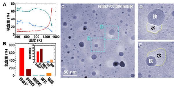 进一步,该团队研究了不同月球矿物中的含氢量区别。在五种月壤主要矿物即钛铁矿、斜长石、橄榄石、辉石、月壤玻璃中,钛铁矿(FeTiO3)含氢量最高,其次是斜长石和月壤玻璃,钛铁矿的含氢量约是斜长石的3.5倍、是月壤玻璃的10倍。电子显微镜下的原位加热实验证明,月壤钛铁矿加热后将同步生成大量单质铁和水蒸气气泡,而其他含铁月壤矿物加热后生成了少量铁单质和气泡,地球上的同种矿物加热后则不会生成单质铁和气泡。这进一步证明了月壤矿物中固溶的氢是产生水的关键。
