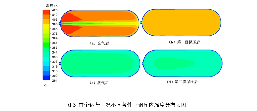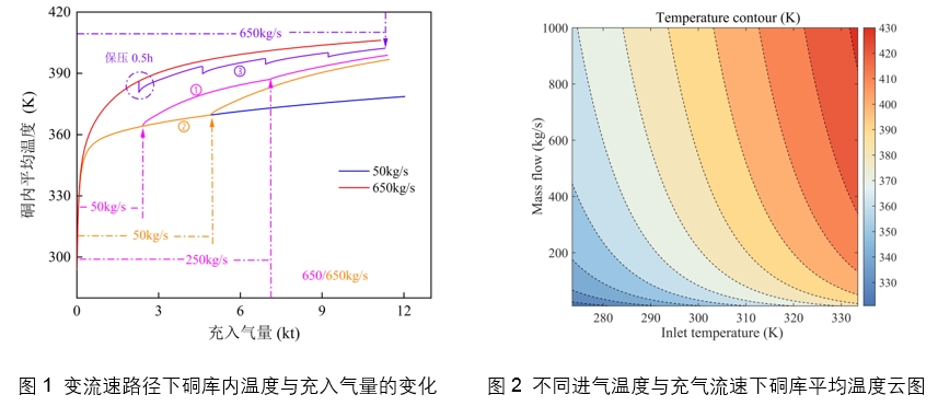 为此,中国科学院武汉岩土力学研究所计算岩石力学研究团队提出了一种新的基于压缩空气动力学的库内温压计算方法,通过模拟工程尺度库内气体流动,可以为地下储气库提供更加真实、全面的热力学行为模拟和预测。团队采用该方法开展了热力学条件下硐库选型参数研究、硐库运营期变化规律以及密封结构传热特性相关研究,主要研究成果如下:1)长径比较小时,库内温度分布较为均匀,随着长径比的增大,库内温度出现分层现象,并在硐库尾端出现高温区(闷顶效应);2)进气温度和充气流速是影响首次充气加压阶段硐内平均温度的关键因素,循环运营阶段,硐内压力工作压力之间规律波动,库内空气平均温度随着运营时间增加呈下降趋势,并趋于稳定;3)受库内空气对流换热与热传导的影响,密封层与衬砌在整个工作条件下温度变化明显,围岩温度在小范围内受到库内温度影响。该研究成果为压缩空气储能地下储气库的结构设计和温控设计提供了理论依据和方法。