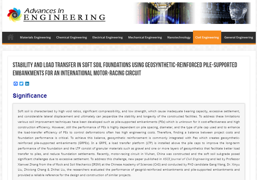 结合本项目,提出了软土桩基负摩阻力中性点的时间效应与计算方法,研发了“赛车场跑道软土路基工后沉降预测软件”和“三向土工格栅加固赛车场软土路基技术效果的分析软件”等工程软件6项;授权了“一种测试软土地区PHC桩负摩阻力中性点的现场试验方法”和“一种CFG桩复合地基桩土荷载分担比的原位试验方法”等中国发明专利4项;在Journal of Geotechnical and Geoenvironmental Engineering、Transportation Geotechnics、International Journal of Geomechanics、工程地质学报等国内外期刊发表学术论文6篇;研究成果被国际工程领域著名机构Advances in Engineering(AIE)遴选为关键科学文章。本项目得到了武汉智慧生态建设投资有限公司、中建二局等单位的大力支持、以及中国科学院青年创新促进会优秀会员的资助。