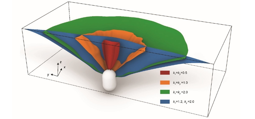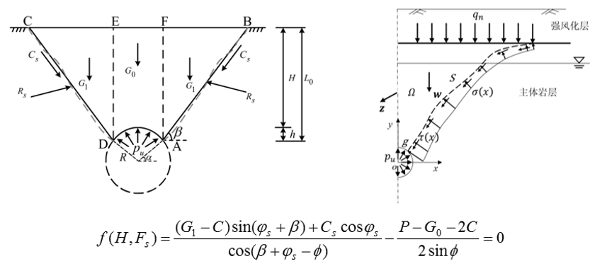 为此,中国科学院武汉岩土力学研究所计算岩石力学研究团队针对地下内衬硐库这一大型高压容腔上覆岩体稳定性问题,建立了二维隧道式和三维大罐式上覆岩体潜在破裂面求解方法和安全系数计算方法,并提出了安全系数控制标准,量化了硐库失效模式与埋深关系,为工程设计提供了安全埋深的理论依据。主要研究成果如下:1) 基于岩体极限应力场和Mohr-Coulomb 准则,将潜在破裂面的求解问题归结为常微分方程的初值问题,并建立了求解框架,确定了起裂角和破裂角;2)构建了适用于隧道式地下硐库上覆岩体滑裂面的锥体模型;3)建立了更普适的内衬洞库极限受力状态下的被动岩土压力抗剪力学模型(隧道式和大罐式)和安全系数求解方法;4)厘清了地下内衬硐库的失效模式与埋深关系,提出了安全埋深的确定方法,讨论了安全系数控制标准。