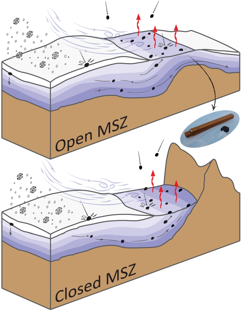 图1 两种陨石富集机制的示意图:淹没屏障(开放式陨石搁浅带)和浮现屏障(封闭式陨石搁浅带)。棕色示意基岩,蓝色示意冰盖(颜色越深年龄越大),白色示意雪;红色箭头代表消融(升华),灰色箭头示意富含陨石的冰雪流动,黑点示意陨石(Tollenaar,2022)