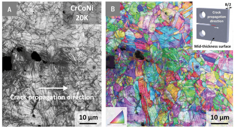 鉴于其特殊的损伤耐受性,研究者通过在液氦环境下进行单轴拉伸试验和基于J的非线性弹性断裂韧性试验,研究了CrCoNi和CrMnFeCoNi合金在更低温度(~20K)下的机械性能。CrCoNi合金的冲击试验报告显示,在77K时,夏比V型缺口能量高达400J,在4.2K温度时减少了10%。然而,仍然不清楚包含尖锐裂纹的样品在低于77K的温度下会有什么表现,在那里强度和延展性的温度相关性已被报告。此外,在接近液氦的低温下,还没有对中熵或高熵合金进行完整的电阻曲线测量,以确定裂纹起始和裂纹增长的断裂韧性。除了测量裂纹起始和裂纹增长的韧性(及其相应的基于应力强度的数值),研究者还进行了原位中子衍射测量和广泛的断裂后电子反向散射衍射(EBSD)分析、断裂成像,特别是透射电子显微镜,以详细检查突出的塑性变形机制和缺陷行为,代表其特殊断裂阻力的根本基础,发现与大多数金属材料不同,随着温度的降低,其阻力逐渐增加。
