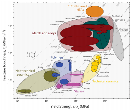 图5. 根据断裂韧性Kc与屈服强度sy的Ashby图,适用于各种材料