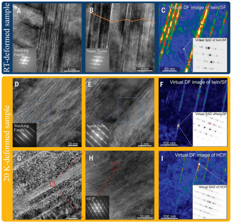 图4. 293和20K下断裂表面附近CrCoNi合金变形微观结构的HRTEM和4D-STEM表征