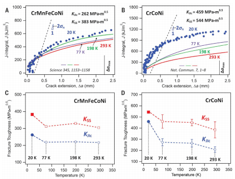 图1. CrCoNi和CrMnFeCoNi合金的J-R曲线和断裂韧性值随温度的变化