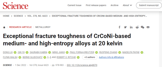CrMnFeCoNi合金已经有了一些衍生物,最引人注目的是单相等原子CrCoNi中熵合金(MEA),它显示出更好的性能。在77K,这种MEA被发现具有273 MPa·m½的KJIc和超过400 MPa·m½的Kss。尽管强度和韧性通常是相互排斥的特性,但CrCoNi合金表现出特别高的损伤耐受性,其断裂韧性值是有史以来最大的。这种CrCoNi基多主元素合金显然是在极端环境中潜在应用的强大候选材料,例如在非常高的应变率和低温下。