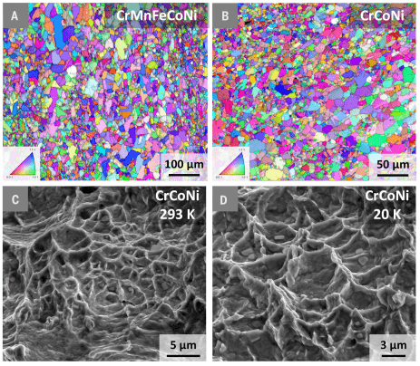 尽管它们具有极高的断裂韧性,但这些合金并没有复杂的微观结构,因为它们是简单的单相固溶体(图2,A和B)。因此,立即出现的一个重要问题是这种特殊的抗断裂性的起源,以及为什么它在低温下会如此逐渐增强。