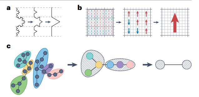 图1.几何和网络系统中的迭代粗粒化。(a)科赫曲线,一个递归构造的分形,通过反转局部构造规则进行粗粒化。(b)正方形网格上的伊辛模型,用 Kadanoff 的块方法进行粗粒化(每个 3×3 块中的上/下自旋被大多数自旋方向所取代)。(c)树状网络(左图)被划分成不同颜色的方块。粗粒度网络(中图)中的超级节点集中了每个区块的节点,该过程通过重复寻找块(条纹气泡)进行粗粒化。这就引出了两节点的网络(右图)。