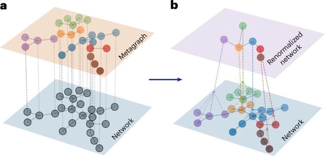 伊辛模型从顺磁到铁磁相变的临界点,可通过粗粒化过程的不变性确定。重整化群是研究物理系统中这种尺度变换效应的一套技术。Pablo Villegas 及其同事的论文 [1],将重整化的范围扩大到超越网格结构的任意网络系统。