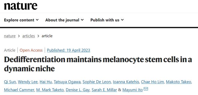 2023年4月19日,纽约大学格罗斯曼医学院Mayumi Ito教授团队(Sun Qi为第一作者)在Nature发表了题为:Dedifferentiation maintains melanocyte stem cells in a dynamic niche 的研究论文。