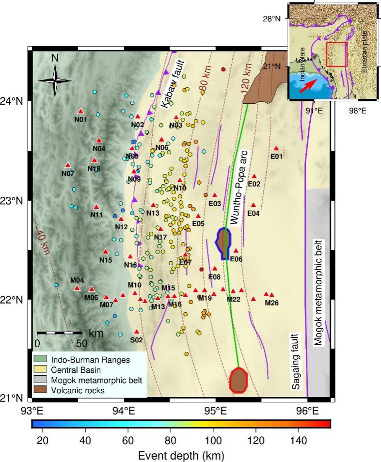 图1 缅甸中部构造简图。红色三角表示地震台站,圆圈表示地震事件。棕色虚线和紫色实线分别表示俯冲板片上界面深度和断层