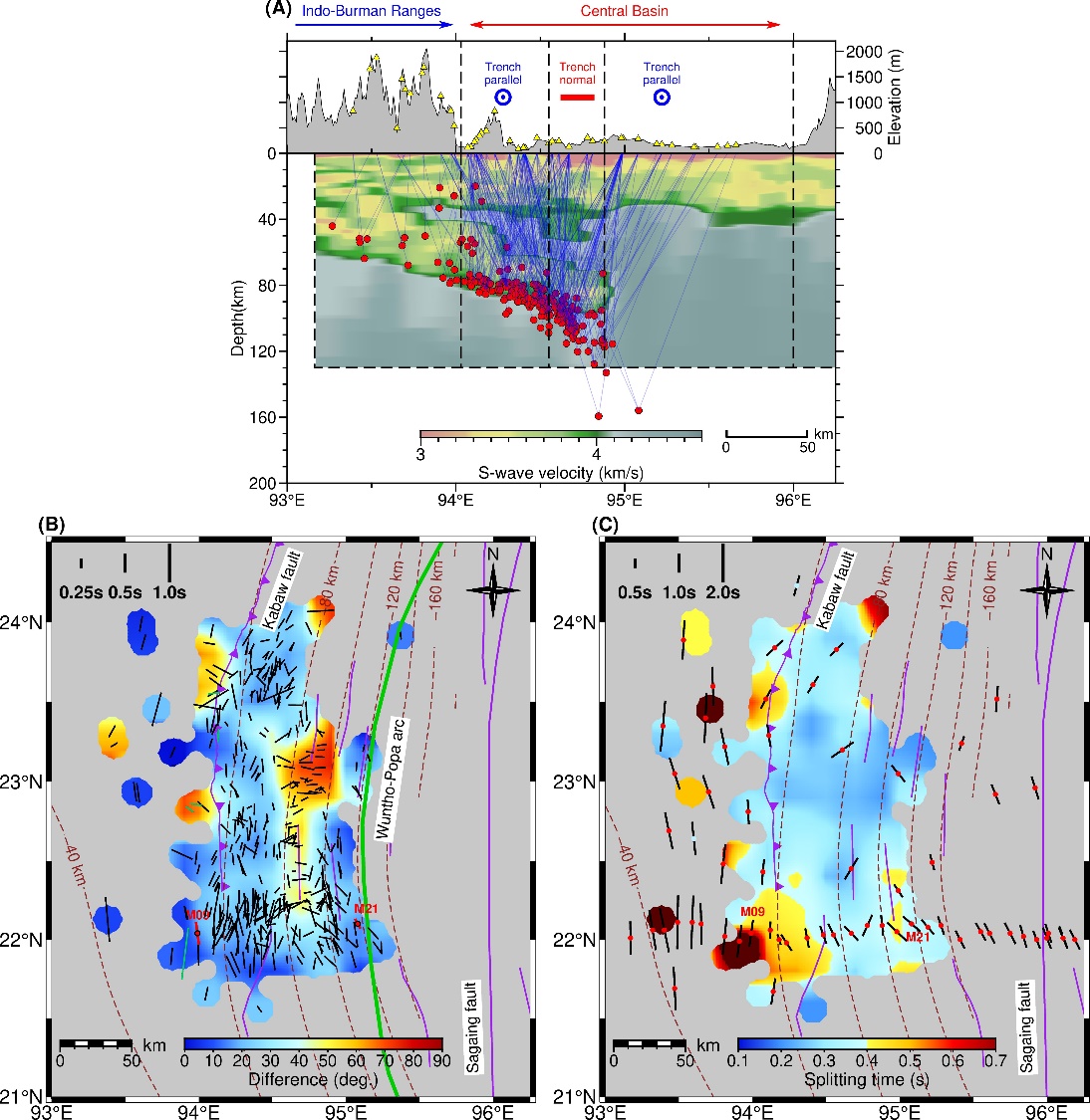 图2 (A)射线路径(蓝线)的横截面示意图。黄色三角和红色圆圈分别表示台站和事件,上图和下图分别表示地表高程和剪切波速度。(B)近震剪切波分裂结果(黑色短棒),底图颜色表示快波方向和俯冲板片走向的差异。(C)远震剪切波分裂结果(黑色短棒),底图颜色表示分裂时间大小