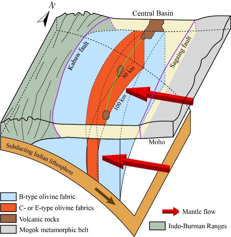 图3 缅甸中部下方地幔楔中地幔流动模式和不同类型橄榄石结构分布示意图