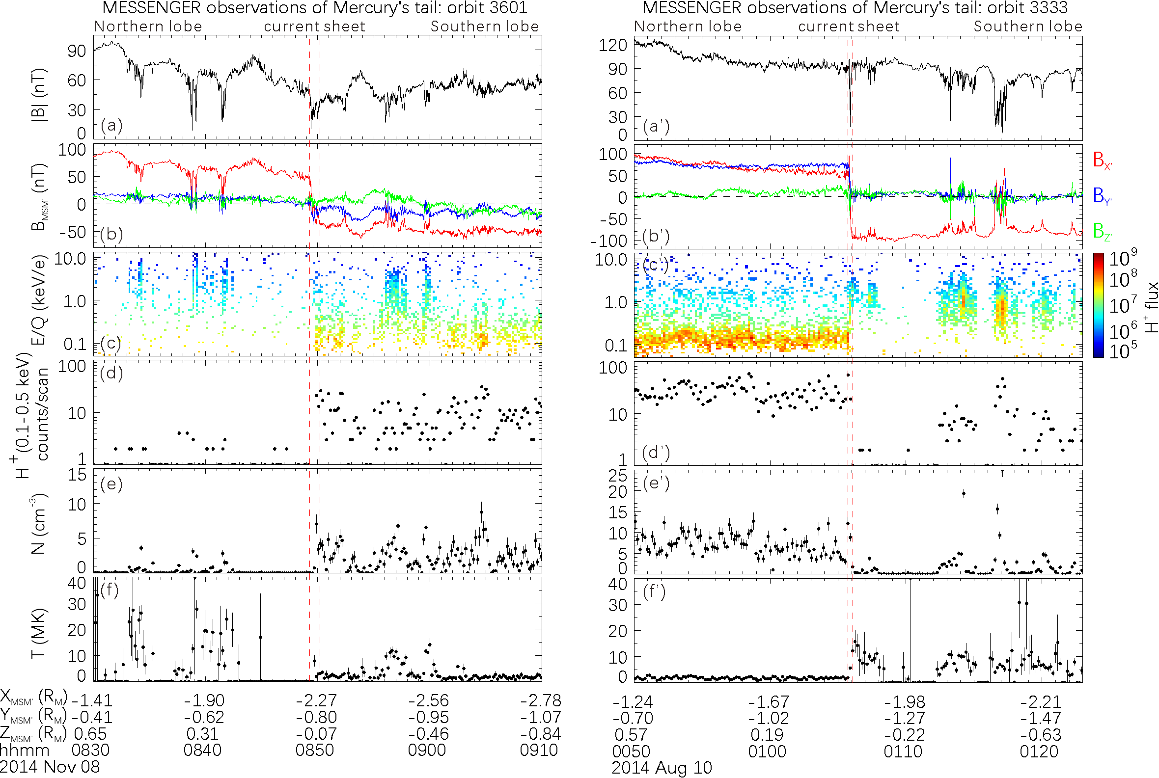 图1 水星近磁尾南北半球密度不对称观测事例。(a,a')磁场大小,(b,b')磁场三分量,(c,c') H+能谱,(d,d')低能H+计数率,(e,e')H+数密度,(f,f')H+温度