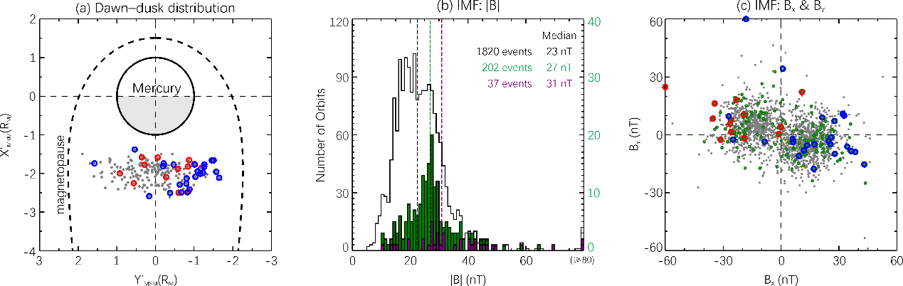 水星近磁尾太阳风注入事件的观测特征显著区别于通常情况下的尾瓣等离子体“空穴”区。如在轨道3601(图1左),稠密低能离子充满南半球(BX < 0)区域,而在轨道3333(图1右)发生在北半球(BX > 0)区域;这些太阳风粒子可以深层注入到近磁尾电流片处。通过分析202个穿越水星近磁尾电流片的轨道数据,发现37个类似事件。统计分析表明这些事件在空间上更易发生在晨侧(图2a);倾向出现于强行星际磁场条件下(图2b);粒子注入南或北半球与所处行星际磁场扇区结构密切相关(图2c)。